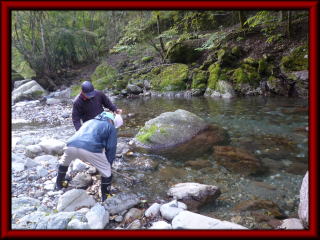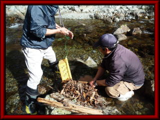 以下、上北山村漁業協同組合員によるアマゴ発眼卵の放流作業の様子です。