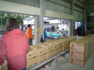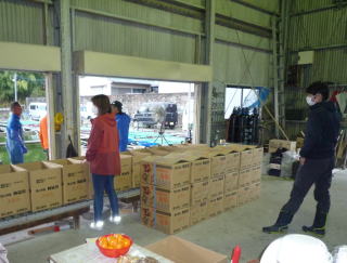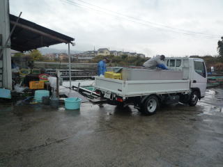 朝からの雨の中、県内水増殖漁業協同組合(大和郡山市)でフナ稚魚の配布を